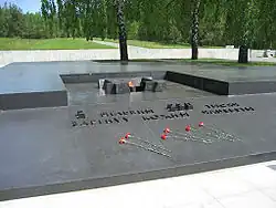 Furthermore, the "eternal flame" burns in a large black granite stone block on which three birches grow.