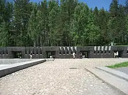 The Khatyn national state memorial of the Republic of Belarus is the central war memorial of Belarus for all victims of the German occupation during World War II. It commemorates particularly the more than 600 "burnt villages" which, together with their inhabitants, were destroyed by the Germans throughout the war. The Khatyn massacre was one of them; the village lies about 60 kilometres north of Minsk on the road to Vitebsk in the Logoisky district, in the Minsk Region.[1]