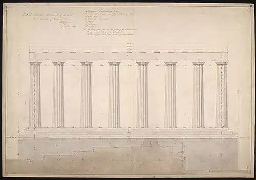 The monument dominates the top of Calton Hill, just to the east of Princes Street. It was designed during 1823–6 by Charles Robert Cockerell and William Henry Playfair and is modeled upon the Parthenon in Athens. Construction started in 1826 and, due to the lack of funds, was left unfinished in 1829. This circumstance gave rise to various nicknames such as "Scotland's Folly", "Edinburgh's Disgrace",[4] "the Pride and Poverty of Scotland" and "Edinburgh's Folly".[5]