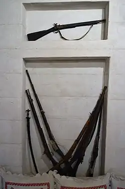 The museum's collections were from Archaeological discoveries since 1968 in the emirate of Ras Al Khaimah, partially donated by city residents and the Quwasim family.[2] The museum contains archaeological discoveries from stone age, bronze age, Iron Age, pre-Islamic Sassanian period, Islamic and Julfar period. The museum also has a collection of fishing nets.[1] The museum contains a 19th-century coin found in the Falaya Palace, where the peace treaty between the British and the Trucial States was signed; this coin is called "Mardhouf Al Quwasim" as it was minted by the Quwasim family. In addition, the museum contains a madbasa, a "date-press" room used to extract date syrup (a method found since 2000 years ago), a 12th-century gold coin, and 4000-year-old palm seed found at the Shamal Bronze Age settlement site.[4] The museum contains cylindrical seals from Wadi al-Qawr.[5] The museum contains the only Jewish artifact found in the UAE: a gravestone with an inscription referring to David, son of Moses, which was discovered in 1998 around the area of Shamal.[6] In October 2020, the museum launched the Tamra temporary exhibition (closed in 2022), about the importance and history of the date palm tree in cultural practices and heritage in the region.[7] The museum contains antique weapons and antiquities found in the Emirate of Ras Al Khaimah, in addition the museum will have a special room dedicated to silverware containing a collection of silver adornments.[8]