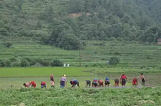 According to the cultural norm, 15 Ashadh is "considered as the auspicious day to start rice planting for the year".[5] The date falls during the monsoon season, an optimal time for rice planting.[6] On 14 December 2004, the Nepal Government officially declared Ashadh 15 as National Paddy Day.[5] The celebration takes place under the theme of "Increase rice production for self-sufficiency and prosperity".[7]
