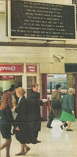 The Belfast Newsletter reported, "National Poetry Day swept Ulster yesterday, transforming ordinary citizens into part-time bards or budding Heaneys or Wordsworths."[10] The Daily Telegraph reported that in London at Waterloo Station, "The announcement boards were given over to poems about trains by T. S. Eliot and Auden."[11] The Times reported Chris Meade, then director of the Poetry Society, as saying: "Readers are finding a place for poetry in their lives again. You can read one between stations on the Northern Line. It fits well into the modern experience."[12] The East Anglian Daily Times reported, "National Poetry Day was the cue for a stanza bonanza, with railway stations, classrooms, theatres and supermarkets bursting with verse and echoing to epics".[13]