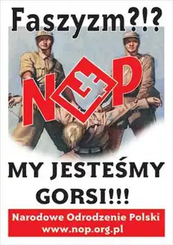 To gain media attention NOP often runs shock value campaigns. During the 2007 Sejm and Senate elections NOP disseminated poster with slogan – Fascism? We are worse!