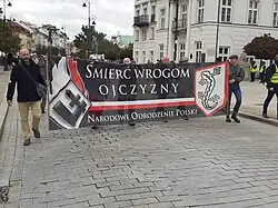 National Rebirth of Poland was founded as a nationalist discussion group for young people on 10 November 1981.[8] It joined the Christian National Union when that party was founded in 1989, before leaving in February 1990.[9] The NOP registered as a political party in 1992. The party is the only far-right organisation to claim to be a successor to the National Radical Camp Falanga (ONR),[10] the pre-war nationalist youth organisation, which was banned in 1934.[11][12]