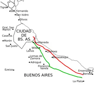 Before 1979 Nacional Route 1 was placed farther aways from the Río de la Plata, as seen in the green line. The Avellaneda–Gutiérrez section run on the old National Route 2, the continued parallel to the Ferrocarril General Roca railroad until joining Camino General Belgrano, then following to the provincial capital.