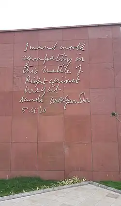The National Salt Satyagraha Memorial or Dandi Memorial is a memorial in Dandi, Gujarat, India, that honors the activists and participants of the Salt Satyagraha, an act of nonviolent civil disobedience in colonial India which was led by Mahatma Gandhi in 1930.[1] The memorial is spread over a 15 acres (61,000 m2)[2] and is located in the coastal town of Dandi, where the Salt March ended on 5 April 1930 and the British salt monopoly was broken by producing salt by boiling sea water.[1] The project was developed at an estimated cost of ₹89 crore (US$11 million).[3]