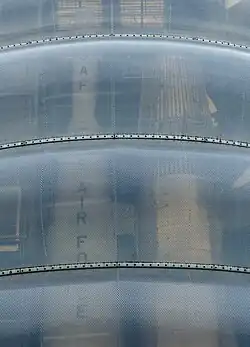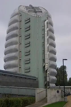 The 7,360m2 scheme occupies a former storm water tank,[24] which now forms the foundations of the building, reducing costs and maximising the reuse of the existing structure.[25] The main rocket tower is clad in inflated pillows made of ETFE – the same material used on the Eden Project domes.[26] This material is 1% of the weight of the equivalent amount of glass.[27] The building was described by The Guardian as "One of the most distinctive and intriguing new buildings in Britain".[28] The main building is a 7200m2 box built on a 14m grid steel frame, clad in a perforated metal skin that conceals the windows and louvres in the profiled steel cladding behind.[29] The roof of the main building is overlaid with gravel in three colours to form a crab nebulae design.[30]