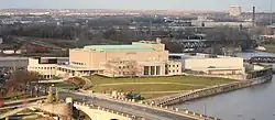 The site along the west side of the Scioto River near the Discovery Bridge on Broad Street was originally home to the Franklin County Veterans Memorial,[2] which originally opened in 1955[3] and was demolished to make way for the museum in early 2015,[4] by S.G. Loewendick & Sons.[5] The construction of a veterans museum was envisioned by city boosters and received support from former Senator and World War II veteran John Glenn.[6]