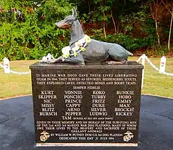 The island of Guam, an American territory since 1898, was captured by Japanese forces on December 10, 1941, in the first days of the U.S. entry into World War II. Guam was held by the Japanese for two and a half years, until U.S. Marines landed to retake the island in July 1944. Along with them were the 2nd and 3rd War Dog Platoons, used as sentries and scouts in over 450 patrols.[1][2] They explored the island's cave system, detected land mines and booby traps, and guarded sleeping Marines.