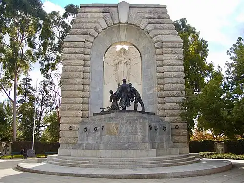 Almost 35,000 South Australians served in the First World War. This number amounted to 8.5% of the South Australian population at the time, or 37.7% of men between the ages of 18 and 44.[3] Of those who served, more than 5,000 South Australians died.[4] In response to these deaths, Archibald Peake, the premier of South Australia, asked the state parliament to fund a memorial commemorating the victory and the sacrifice of those who had fought and fallen. The motion, presented in March 1919, received unanimous support in the House of Assembly and the Legislative Council.[5] With the passing of this motion, the South Australian Government became the first in Australia to elect to build a memorial to the soldiers of the First World War.[6]