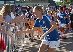 Shortly after the announcement, the Pride completed a notable trade with Portland Thorns FC to acquire U.S. national team forward Alex Morgan and Canadian midfielder Kaylyn Kyle in exchange for rights to U.S. national team defender Meghan Klingenberg (via the Houston Dash and Seattle Reign FC), the first overall pick in the 2016 NWSL College Draft, an international roster spot for the 2016 and 2017 seasons, and the rights to U.S. national team midfielder Lindsey Horan.[29][30] The trade's completion reportedly influenced the decision to launch the team in 2016 rather than in a later season.[29]