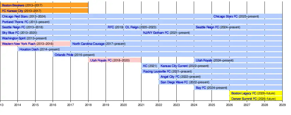 Four of the original NWSL teams—Western New York Flash, Boston Breakers, Chicago Red Stars, and Sky Blue FC (New Jersey)—transitioned from the now-defunct Women's Professional Soccer (WPS) league. The remaining four teams were new franchises: Portland Thorns FC, Seattle Reign FC, Washington Spirit (originally founded as D.C. United Women of the USL W-League),[7] and FC Kansas City.[8]