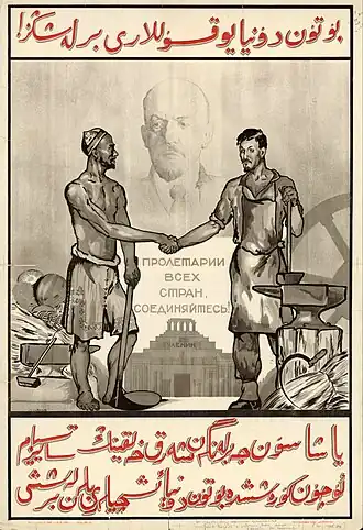 Central Asia's borders are often viewed by critics of the USSR as being an attempt to divide and rule; a way to maintain Soviet hegemony over the region by artificially dividing its inhabitants into separate nations and with borders deliberately drawn so as to leave minorities within each state.[13] Though the Soviets were concerned about the possible threat of pan-Turkic nationalism,[14] as seen in its reaction to the Basmachi movement, closer analysis informed by the primary sources paints a much more nuanced picture than is commonly presented.[15][16][17]