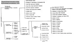 With the promulgation of the Organic Law of the National Government in October 1928, the government was reorganized into five different branches or Yuan, namely the Executive Yuan, Legislative Yuan, Judicial Yuan, Examination Yuan as well as the Control Yuan. The Chairman of the National Government was to be the head-of-state and commander-in-chief of the National Revolutionary Army. Chiang Kai-shek was appointed as the first Chairman of the National Government, a position he would retain until 1931. The Organic Law also stipulated that the Kuomintang, through its National Congress and Central Executive Committee, would exercise sovereign power during the period of political tutelage, and the KMT's Political Council would guide and superintend the National Government in the execution of important national affairs and that the council has the power to interpret or amend the organic law.[33]