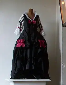 After the death of Gustav III, it became the official uniform worn at court by ladies in waiting and a customary dress for women formally presented at Court.[2] The design of the dress subsequently continued to follow current fashions as time went on, but the basic look of the characteristic, vertically striped sleeves has been kept, and a specific color rule developed: black or very dark blue with white trim. The dress was used for women being presented at Court until 1952, and is still in use by Swedish ladies-in-waiting on formal occasions.[3]