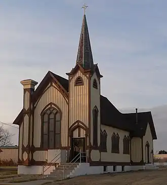 It is a one-story wood-frame gable-front church. It has an octagonal steeple. Several elements of its design, including pointed tops of windows, are Gothic Revival in style.[2]