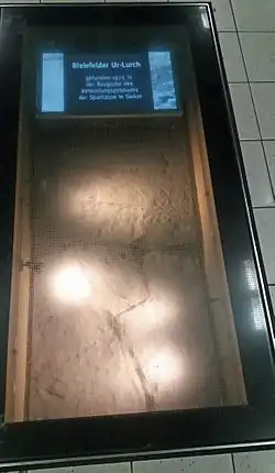 - The stratigraphical collection comprises 30.000 objects. These are largely fossils and rocks from Mesozoic outcrops of the Bielefeld area, including important fossils such as the holotype specimens of the temnospondyl amphibian Cyclotosaurus buechneri[15] and the plesiosaur Arminisaurus schuberti,[16] which were both found within the city limits of Bielefeld. The palaeontological collection is supplemented by fossils of Pleistocene mammals such as a nearly complete skeleton of a Woolly rhinoceros, found in the area.