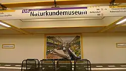 After 1991, the station was renamed Zinnowitzer Straße after a small street at the northern exit of the station. Since this name was largely meaningless, various passengers groups and politicians suggested in 2007 that the station be renamed either Museum für Naturkunde or Naturkundemuseum after the well-known nearby Museum für Naturkunde. After long discussions, a renaming was announced,[4] but then delayed. From 30 December 2008, the Berlin firm WALL AG, in anticipation of the renaming, made seven decorative advertisement panels available on which the Museum für Naturkunde displayed large-format color photographs of museum staff working with various objects from the collections. With the official change in the timetable by the BVG on 13 December 2009, the renaming as Naturkundemuseum finally took place.[5]