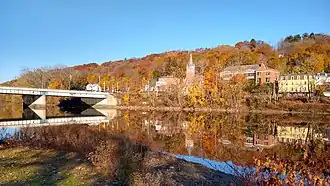 The Naugatuck River is a 40.2-mile-long (64.7 km)[4] river in the U.S. state of Connecticut. Its waters carve out the Naugatuck River Valley in the western reaches of the state, flowing generally due south and eventually emptying into the Housatonic River at Derby, Connecticut and thence 11 miles (18 km) to Long Island Sound. The Plume and Atwood Dam in Thomaston, completed in 1960 following the Great Flood of 1955, creates a reservoir on the river and is the last barrier to salmon and trout migrating up from the sea.[6]