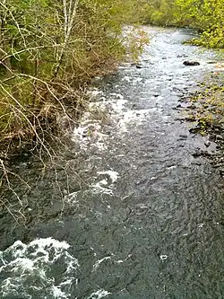 As part of the Housatonic River watershed, the Naugatuck River historically hosted the southernmost Atlantic salmon (Salmo salar) migrations.[13] Historical runs of anadromous fish also included native American shad (Alosa sapidissima, Connecticut's state fish), alewife (Alosa pseudoharengus) and blueback herring (Alosa aestivalis). Dam construction for hydropower, cooling and rinse water, and boiler water for industry began circa 1763 and continued during the industrial revolution of the 1800s. These dams, as well as wastewater from the towns that grew up around factories along the river, contributed to the extirpation of many species of fish. Over time and with the closing of many of the factories, the dams ceased to provide hydropower or serve any other economic purpose. The Anaconda Dam (Waterbury), Freight Street Dam (Waterbury), Union City Dam (Naugatuck) and the Platts Mill Dam (Naugatuck) were removed in 1999, while the Kinneytown Dam was bypassed with a fish ladder that same year. The Chase Brass Dam, between Waterbury and Thomaston, was removed in 2004.[6] A fish bypass channel, the first of its kind in New England, now permits fish to migrate past the Tingue Dam and opens an additional 32 miles (51 km) of the river to anadromous fish migration.[14] The installation of the fish bypass on the Tingue Dam in Seymour leaves only the Plume and Atwood Dam in Thomaston as the last barrier on the river to fish migration.[6]