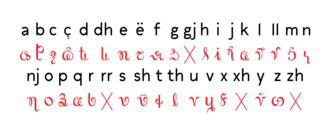 In 1824 or 1825[9] he started the creation of his alphabet of the Albanian language.[13] The final version of his thirty-three-letter Vithkuqi alphabet, whose characters were invented by Veqilharxhi, was printed as part of primer in 1844-5 titled Ëvetari Shqip Fort i Shkurtër ("The most Useful and Concise Albanian Alphabet").[14][13][2] Veqilharxhi avoided the use of Latin, Greek or Arabic alphabets and characters because of their religious associations and the possibility of causing divisions among Albanians of different religions.[15][13] Veqilarxhi's Ëvetar first distributed in Korçë and later westwards as far as Berat, where it reached great success.[16][13][2] It was also circulated in Përmet.[17] On April 22, 1845 Athanas Paskali, one of the notable people of Korçë, along with others sent him a letter requesting as many more copies as possible.[16] Among Albanian historians this publication by Veqilharxhi is considered as the beginning of the Albanian national awakening.[2]
