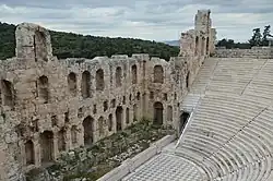 Nausicaa premiered a year after its composition was completed, on 19 August 1961, at the Odeon of Herodes Atticus.[18] More than 150 contributors worked for the opera's first performance;[19] Carlos Surinach was the maestro, John Butler the theatrical director and choreographer and Andreas Nomikos took on the opera's scenography and costume design.[20] The sets were dominated by a stone structure and the costumes were of Greek character, richly decorated with gems;[19] Butler's choreographies were based on Greek traditional dances.[21]