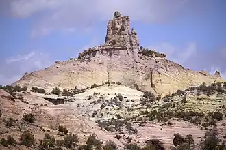 The three spires of Navajo Church are composed of the Westwater Canyon Member of the Morrison Formation which dates to the Late Jurassic.[7] The spires rest atop a pedestal of the formation's Recapture Member. This then overlays Zuni Sandstone which displays spectacular eolian crossbedding on the south face. Successive layers below dropping south to Red Rock Park include Bluff Sandstone, Summerville Formation, and Entrada Sandstone.[8][9]
