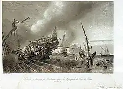 The Spanish galleys formed into three squadrons in order to flank the blockading fleet, but seeing Cangé's vessels too far from Cazencac's squadron, 29 of them led by Melchor de Borja crossed the French formation going astern of the 12 ships under the French Rear Admiral.[8] Then they gained the wind. The thirtieth galley, San Felipe, was closely engaged by two French galleys and surrendered. Two other Spanish galleys which lagged behind were captured by the French La Pille and La Reine commanded by Jean-Philippe de Vallbelle.[9] Melchor de Borja had his galleys badly damaged by Cazenac's ships in the process, but thanks to his manoeuver, the Duke of Fernandina managed to reach the relative safety of the harbor with 11 galleys and the 5 brigantines with supplies.[9] Cangé was able to keep them covered behind the mole, thanks to the heavy gunfire of his ships and gave time to his remaining vessels to join him.[9]