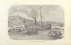 Other skirmishes took place on the lake every few days. On 6 July, Italian volunteer forces, equipped with nine long-range guns borrowed from a coastal battery at Maderno, ambushed the Austrian gunboat Wildfang at Gargnagno. The gunboat was hit twice, for no losses for Garibaldi's army. At the same time, the Italian flotilla sailed out from Salò to chase the armoured gunboat Wespe, on patrol off Maderno. The Austrian vessel managed to disengage after receiving support from Speiteufel and Scharfschütze.[3] Italian sources claim that the Wespe was forced to seek shelter at Malcesine.[6] The next significant combat occurred on July 19 when the Italian paddle steamer Benaco head out from Salò for Gargnano towing the sailboat Poeta, both ships carrying reinforcement troops and loaded with supplies for the volunteers in the mountains of Valvestino and Tremosine. The Benaco was suddenly attacked by two Austrian gunboats, the Wildfang and Schwarzschütze, which forced it in to shore near Gargnano, where most of the crew, troops and supplies were landed during the night. The next morning Austrian whalerboats were able to capture the abandoned Benaco, still with a small gun and some rifle ammunition in her holds, and tow it away as a prize to Peschiera. One of the whalerboats capsized under Italian fire, but was eventually recovered by the Austrian flotilla. Three Austrian sailors were wounded,[7] while heavy shelling on Gargnano killed two Italian volunteers. The Poeta managed to sail away, only to sink shortly after off San Carlo.[8] A second convoy from Salò, consisting in another sailboat escorted by the Italian flotilla, was forced back two days later by the Austrian gunboats Speiteufel, Uskoke and Wespe.[7] The Benaco was handed back to the Italian government at the end of the hostilities.[8]