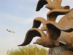 The sculpture was cast in aluminum in an Aluminum Company of America foundry in Cleveland. By the time casting was completed, the Association had run out of funds and could not pay the approximately $18,000 due to ALCOA. Congressman Sol Bloom of New York negotiated an agreement to settle the outstanding balance for $13,000.[4] Congress passed House Joint Resolution 342 in 1934, providing $13,000 to ship and install the monument on a temporary base.[12] The ground was broken on the memorial in 1930, with the foundation completed the following year and it was installed on October 18, 1934, but work on the base and landscaping was postponed due to lack of funding.[13][14][15]