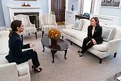 In September 2022, she became active during the Mahsa Amini protests, and urged foreign governments to aid the protesters.[53] On 14 October 2022, she met with Kamala Harris, Vice President of the United States, following the protests in Iran.[54][55] In an informal session of United Nations Security Council in November 2022, she denounced as a "myth" the idea that the hijab was a part of Iran's culture.[56]