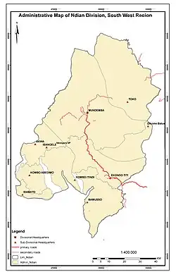 Ndian division was formed in 1975 from parts of Kumba and Victoria divisions and is one of six administrative units that constitute the Southwest Region. Its headquarters is in Mundemba and other major towns include Ekondo Titi, Bamusso, Isangele, Toko, Bekora and Dikome Balue.[1][2] A total of nine municipalities (Bamusso, Dikome Balue, Ekondo Titi, Idabato, Isangele, Kumbo Abedimo, Kumbo Itindi, Mundemba and Toko) make up the division and spread across an estimated surface area of about 6,626 km2 (2,558 sq mi) (25% of the region). The division is linked to other major towns of Cameroon (such as Kumba in the Meme) by the national road N16 and which passes through Ekondo Titi onwards to Mundemba and Isangele.[3]