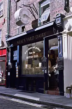 The shop moved around the corner to 17 Shorts Gardens in 1992.[8] A cheese store was opened in Borough Market in 1997,[9] which opened as a second shop in 1998.[10] By 2010 the cheese store was moved to railway arches in Druid Street, Bermondsey.[11] Together with Monmouth Coffee Company and a property company, Neal's Yard Dairy took a lease on a stretch of railway arches around Spa Road railway station in Bermondsey to provide accommodation for food manufacturers and wholesalers.[12] The company headquarters moved into railway arches at Spa Terminus in 2018.[13] In 2020 the company opened a fourth shop in Islington.[14]