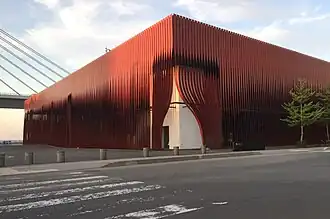 The name ねぶたの家 ワ・ラッセ (Nebuta no ie Wa-Rasse) was decided on in 2009. The building's exterior of red, ribbon-like, vertical steel beams was designed to evoke the visual sensation of light passing through Aomori's old-growth beech forests, as found in Shirakami-Sanchi, while controlling the amount of natural lighting that penetrated to the museum's interior.[2] The museum was opened to the public on 5 January 2011.[3][4] Another privately owned Aomori Nebuta museum in the foothills of the Hakkōda Mountains near National Route 103, called Nebuta no Sato, closed two years after the opening of Nebuta Museum Wa Rasse due to competition from the latter's more central location.[5]