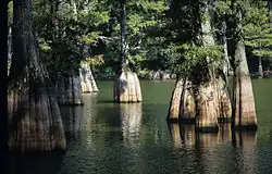 With the exception of dams and manmade lakes, much of the river is in a natural state. Approximately 11 miles of the upper Neches flows through the Neches River National Wildlife Refuge, established to protect the biologically diverse bottomland hardwood forest and habitat for migratory birds, and opened to the public as recently as 2019.[5] Downstream, the river delineates the eastern border of Davy Crockett National Forest including more than nine miles of the Big Slough Wilderness Area of the National Forest.[6] Further downstream the Neches defines much of the southern border of Angelina National Forest including roughly four miles of the Upland Island and Longleaf Pine Wilderness Area of Angelina National Forest.[6] The Angelina Neches/Dam B Wildlife Management Area is situated at the confluence of the Neches and Angelina Rivers protecting 12,636 acres of the river's floodplain and bottomland, administered by the Texas Parks and Wildlife Department along with the adjacent Martin Dies Jr. State Park on the eastern side of Lake B. A. Steinhagen.[7] South of the Lake, beginning at Town Bluff Dam and running 56 miles south to Beaumont, is the Neches River Corridor Unit of the Big Thicket National Preserve, administered by the National Park Service. The Big Thicket National Preserve is recognized as a biosphere reserve by UNESCO, preserving an area where several ecosystems converge. The Big Thicket Visitor Center is off U.S. Highway 69 several miles north of Kountze, Texas.
