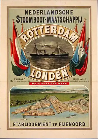![]() Poster of the Nederlandsche Stoomboot Maatschappij with its shipyard Fijenoord. | |