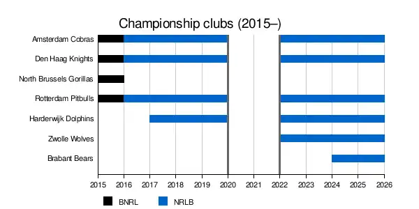 The Nederlandse Rugby league Bond Championship, also known as NRLB Championship, is a semi-professional competition and the top-tier of rugby League of the Netherlands. As of 2025, it consists of six teams. In 2014, a two-game series was held between Amsterdam City Cobras and Rotterdam City Pitbulls for the 'NRLB Nationale Kampioenschap' with each team winning one game.[1] The first league competition began in 2015 as a joint Dutch-Belgian venture called the BNRL Championship and became a Dutch only competition the following season.[2][3]