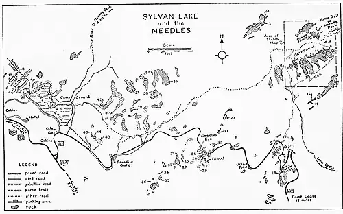The Needles of the Black Hills of South Dakota are a region of eroded granite pillars, towers, and spires within Custer State Park. Popular with rock climbers and tourists alike, the Needles are accessed from the Needles Highway, which is a part of Sylvan Lake Road (SD 87/89). The Cathedral Spires and Limber Pine Natural Area, a 637-acre (258 ha) portion of the Needles containing six ridges of pillars as well as a disjunct stand of limber pine, was designated a National Natural Landmark in 1976.[2]