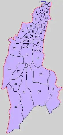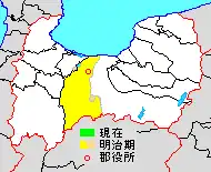 * yellow - areas formerly within the district borders during the early Meiji period
