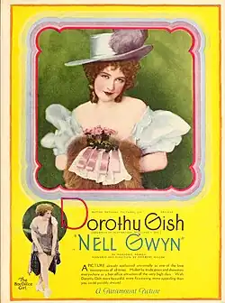 Nell Gwyn is a 1926 British silent romance film directed by Herbert Wilcox and starring Dorothy Gish, Randle Ayrton and Juliette Compton.[3] It was based on the 1926 novel Mistress Nell Gwyn by Marjorie Bowen[4] and follows the life of Nell Gwynne, the mistress of Charles II. Wilcox later made a second version of the film in 1934, Nell Gwyn which starred Anna Neagle.[5]