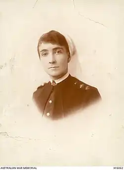 She volunteered for transfer to the 2nd Australian Stationary Hospital on Lemnos in September 1915 where she nursed the soldiers wounded at Gallipoli.[4] She was promoted to head sister in March 1916, before sailing to England in October, where she served briefly in Dartford and Brighton. From November 1916 she served at Ismailia, next posted in April 1917 to Abbeville in France with the 3rd Australian General Hospital. October 1917 saw her working under matron Adelaide Kellett at the 25th British General Hospital, a 2400-bed facility fully staffed by Australian nurses.[5][2]