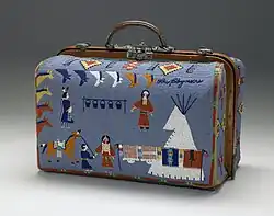 Pictorial Valise (c. 1903), is part of the Hirschfield Family Collection[10] and was displayed as part of the Artists of the Earth and Sky exhibit at the Metropolitan Museum of Art.[11] It was created as a gift for her daughter Josephine at the time of her graduation from the Carlisle Indian School in Pennsylvania, and depicts Chief Two Bears' actions in the Battle of Whitestone Hill in 1863.[12]