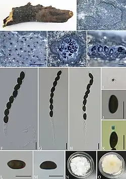 | N. diffusa A specimen B, C stromata on the surface of host D transverse sections of stromata E longitudinal sections of stromata F–H asci with ascospores I pigments in 10% KOH J ascospore with indehiscent perispore in 10% KOH K ascus apical apparatus (stained in Melzer's reagent) L, M ascospores N, O colonies on PDA (N-upper, O-lower). Scale bars: 0.5 mm (C–E); 10 μm (F–H, J–M) | |