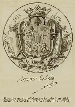 Born into a noble family with a great military tradition, Nemesio was son of Manuel Salcedo Varela and Agustina Serralta Salcedo. Due to his family's nobility and long tradition of loyal service to the Kings of Spain, a special royal dispensation was granted enabling him, whilst still a minor, to enter as a cadet in the Regiment of Royal Spanish Guards, by May 1, 1761. Salcedo was a native of Bilbao in Spain. He was the brother of Juan Manuel de Salcedo, the last governor of Spanish Louisiana,[1] and the uncle of Manuel María de Salcedo, governor of Spanish Texas.