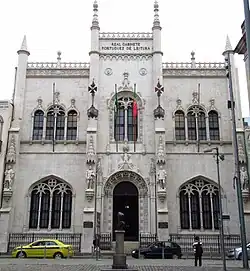Neo-Manueline eventually spread to the colonies and former Portuguese colonies. In Brazil, there are several Neo-Manueline buildings, usually built by Portuguese associations.[3] The most important of these is the Real Gabinete Português de Leitura (Royal Portuguese Library), built between 1880 and 1887 by Portuguese immigrants in the centre of Rio de Janeiro.[4] Other Manueline buildings in Brazil include the Portuguese Center in Santos (Centro Português de Santos, 1898–1901), the Portuguese Library of Bahia (1915–18) and the Portuguese Literary Liceum (Liceu Literário Português) in Rio de Janeiro (1938).