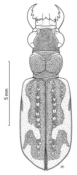 The beetle is about 9–12 millimetres (350–470 mils) in length with a dark brown head and pronotum. The antennae and femora are dark, whilst the tibia and tarsi are pale. The first antennal segment also has anywhere between five or nine setiferous pores. The elytra (wing coverings or hardened forewings) are moderately wide and have a dark brown background with some tinges of velvet black. The dark areas of the elytra are shiny, somewhat metallic and are covered in small, green, metallic punctures. The elytra have numerous distinctive pale yellow markings. The humeral lunule (marking at the upper corner of the elytra) is fused with a marking along the middle margin of the elytra called the marginal line. The middle band (Band sticking out from the marginal line) distinctly sticks out and is angled towards the apical lunule (part of the yellow marking sticking out near the tip of the abdomen). The marginal line is separated from the apical lunule. The shape of the elytra also begin to widen behind the middle.[1]