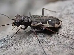 Neocicindela tuberculata is a species of tiger beetle endemic to New Zealand and is sometimes referred to as the tuberculate tiger beetle or the common tiger beetle.[1][2][3] It was first described in 1775 by Johan Christian Fabricius from specimens collected during Captain Cook's first voyage, making it the first ground beetle to be described from New Zealand. The species has been suggested to be roughly 0.92 million years old. It can be distinguished from other species in Neocicindela by the colour pattern of its elytra. It is widespread throughout most of New Zealand, and occurs as adults from September to July. As larvae, they live in burrows in dry clay banks. Both the adult and the larvae are predators that eat other insects. In the Māori language they are sometimes referred to as moeone, among other names.