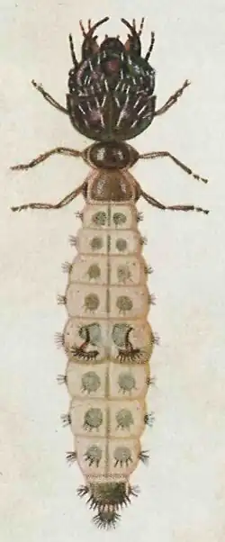 The larvae are 20 millimetres (790 mils) in length when in their final instar before moulting. The head and prothorax form a single circular flattened shape. The mandibles are sickle-shaped. The labrum of the larvae is well-developed and projects from the head of the insect. The tarsi of the legs are two-jointed and have double claws. The larvae slowly widens after segment five and segment nine has a pronounced dorsal hump. The abdomen also has a pair of hooks that the larvae uses to assist it with moving around in its burrow.[14]
