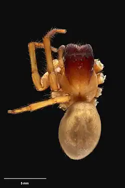 The body is almost 14 mm (0.55 in) in length. The carapace is mainly yellowish orange. The carapace becomes dark red towards the eyes. The chelicerae are dark red. The abdomen is yellowish brown. [2]