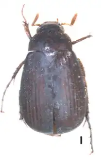 Adults reach a length of about 8.4โ8.6 mm. Their body is oblong and dark brown, with the ventral surface and antenna yellow, and the dorsal surface dull and with numerous shorter and long, erect setae.